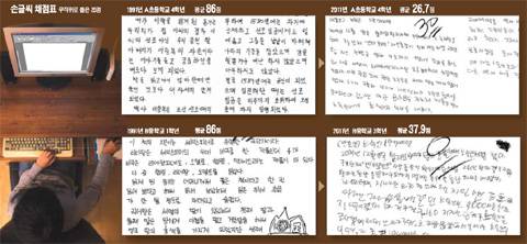 정확한 판별을 위해 대한글씨검정교육회 측에는 잘 쓴 글씨, 못 쓴 글씨 구분없이 무작위로 25건을 추려 보냈다. 20년 전 A초등학교와 B중학교의 평균은 모두 86점. 요즘 학생들의 글씨는 각각 26.7점(A초)과 37.9점(B중)이 나왔다.