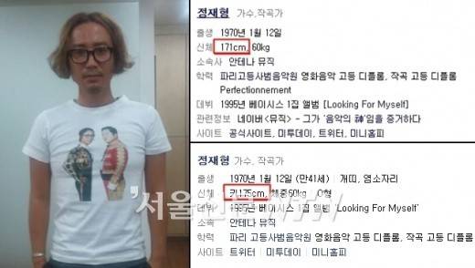 프로필 상 정재형의 키는 175cm로 기재돼 있으나 한 포털사이트에서 무려 4cm를 하향한 171cm로 표기해 놓은 것. 앞서 정재형은 MBC '무한도전'에 출연해 실제 키가 171cm라고 공개한 바 있다.