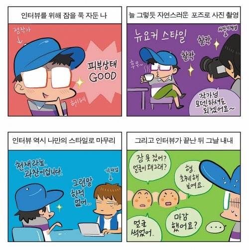 "어머니는 제가 만화가 말고 공무원이 되길 원하셔요. 남자는 자고로 착실한 직장생활을 해야 한다면서 절 볼 때마다 말씀하시죠. 어제도 티격태격했어요. 이렇게 만화가 하고 있는 것 보면 효자는 아니죠. 근데 신문에 나가면 자랑스러워하실 것 같네요."