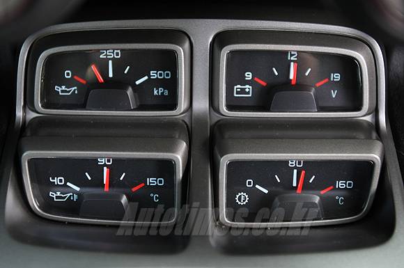 실내는 다분히 미래지향적이다. 두 개의 사각 틀에 각각 속도계와 엔진 회전계가 들어갔다. SF 영화에서나 나올 것 같은 디자인이다. 가운데 위치한 아이스 블루 조명의 트립컴퓨터 창도 역시 미래지향적이다. 오일 압력계, 오일 온도계, 냉각수 온도계, 배터리 전압계는 센터페시어 하단에 2단 배열됐다. 각종 계기장치가 모두 사각형이어서 전반적인 인테리어 디자인 컨셉이 '사각'임을 짐작하고도 남는다.