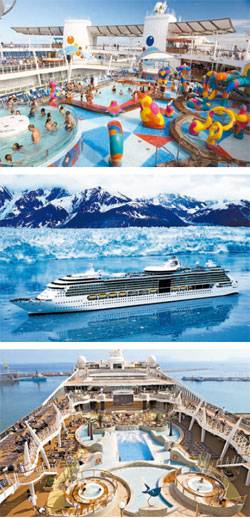 위부터 얼루어호의 어린이 전용 수영장인 'H2O존', 알래스카를 운항 중인 레전드호, 22만t 규모의 오아시스호 선상 수영장.