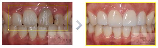 이에 이 환자는 라미네이트 전문치과인 아이러브치과에서 치료를 받았다. 우선 환자가 깨끗하고 환한 치아를 원해 전체적인 치아미백과 함께 심하게 검게 변한 #21번 치아는 실활치 미백과 지대치 미백을 시술한 후 라미네이트 세팅을 통해 건강한 자연치아로 복원.