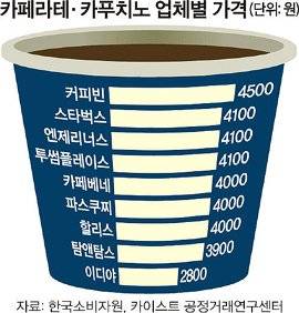 일반 고객이 가장 많이 찾는 카페라테와 카푸치노도 가격 차이가 1700원에 달했다. 커피빈이 4500원을 받아 가장 비쌌고 스타벅스·엔제리너스·투썸플레이스(4100원), 카페베네·파스쿠찌·할리스(4000원), 탐앤탐스(3900원), 이디야(2800원)가 뒤를 이었다. 아메리카노도 커피빈이 4000원으로 제일 비쌌다. 투썸플레이스와 파스쿠찌는 3880원, 스타벅스, 엔제리너스, 카페베네는 3600원, 할리스는 3500원, 이디야는 2500원이다.