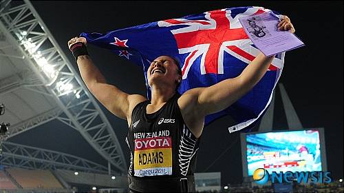 【대구=뉴시스】이동원 기자 = 29일 오전 대구스타디움에서 열린 '2011 대구세계육상선수권대회' 여자 투포환 뉴질랜드의 발레리 아담스가 우승을 차지, 국기를 들과 환호하고 있다.