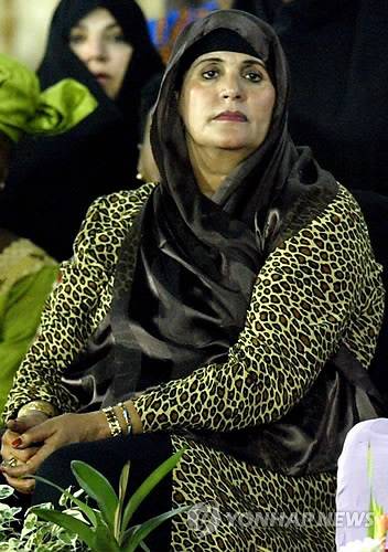 epa02888685 (FILE) A file photograph dated 01 September 2003, shows the wife of Libyan Leader Muammar Gaddafi, Safia Farkash (C) watching a women's military parade on the occasion of Revolution Day ceremonies in Tripoli, Libya. According to media report on 29 August 2011, Algerian foreign ministry in a statement confirmed the arrival of the Gaddafi family members, which it said happened 29 August in morning, and said that Libya's Transitional National Council and United Nations Secretary-General Ban Ki-moon had been informed. Muammar Gaddafi's daughter Aicha, who has arrived in Algeria with the Libyan strongman's wife Safia, two of his sons Mohamed and Hannibal and other members of his inner circle, is heavily pregnant. The TNC Information Minister Mohammed Schammam warned that anyone who gives refuge to Gaddafi would be considered an 'enemy of the Libyan people. EPA/MIKE NELSON < 모바일 애플리케이션 >< 포토 매거진 >< 저작권자(c)연합뉴스. 무단전재-재배포금지. >
