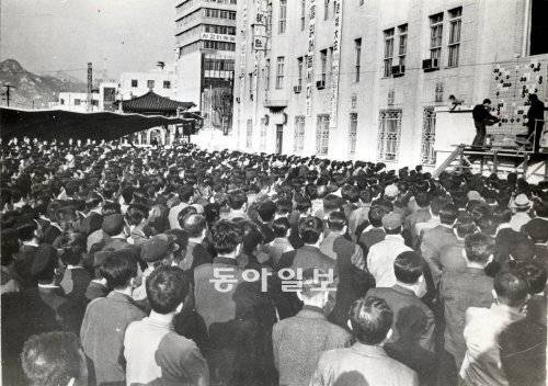 1968년 12월 6일 서울 종로구 세종로 동아일보사 사옥 앞에 대형 바둑판이 설치돼 있다. 일종의 생중계를 위한 속보판이다. 인근 세종호텔 해금강홀에서 벌어진 대국을 바둑기사가 광장에 모인 1000여 명의 시민에게 설명하고 있다.