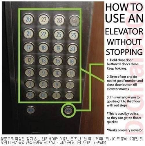 내용은 이렇다. '엘리베이터에 탑승한 뒤 문이 닫힐 때까지 닫힘 버튼을 누르고 있다가 이동을 시작하기 전까지 원하는 층과 닫힘 버튼을 동시에 누르고 있으면 다른 층에서 멈추지 않고 직행할 수 있다. 이는 경찰이 긴급 상황에서 활용하고 있으며 모든 엘리베이터에 설정돼있다.'