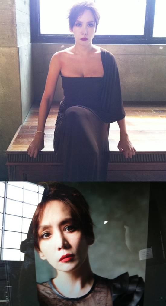 김정은은 진하게 눈 화장을 하고 붉다 못해 갈색 빛이 나는 립스틱을 바른 후 시크한 표정을 지었다. 어깨와 쇄골이 훤히 드러난 검은색 드레스로 섹시한 매력도 잊지 않았다.