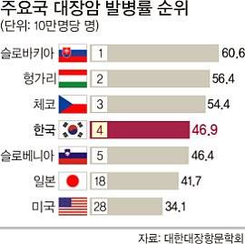 이는 아시아 국가 중 가장 높은 수치로 18위인 일본(41.7명)은 물론이고 대표적 대장암 위험국가로 알려진 미국(34.12명, 28위)과 캐나다(45.40명, 9위) 등 북미 국가나 영국(37.28명, 26위)과 독일(45.20명, 10위) 등 유럽 대부분 국가를 크게 앞질렀다.