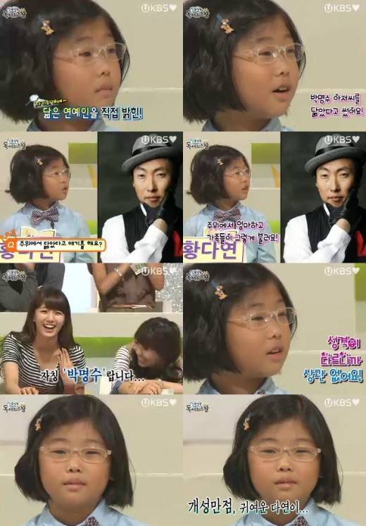 이날 방송에 출연한 황다연 양은 자신 스스로 "박명수를 닮았다"고 밝혔다. 앞서 김태희, 유승호, 지현우를 닮은 빼어난 외모의 어린이들이 '연예인 닮은꼴' 과시를 펼친데 이어, 다연 양은 허심탄회한(?) 커밍아웃으로 폭소를 자아낸 것.