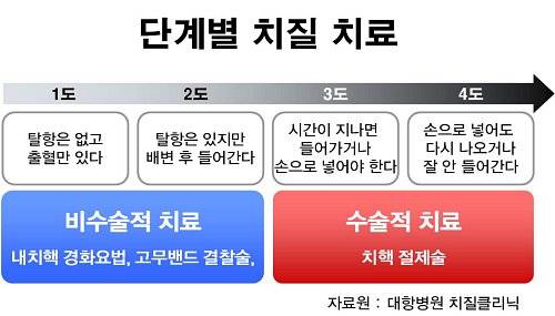 대항병원 이두한 원장은 "치질을 계속 참게 되면 출혈과 통증, 탈항 증세가 동반될 수 있다"면서, "특히 치질이 3기에서 4기로 넘어갈 경우에는 수술이 복잡해질 수 있기 때문에 증상이 나타났을 때 되도록 빨리 병원을 찾는 것이 최선"이라고 강조했다. 초기에 병원을 찾게 되면 식이섬유나 좌욕 등으로 치유도 가능하다. 최근에는 수술법의 개선과 무통주사와 같은 진통제의 발달로 통증없이 수술을 받을 수 있기 때문에 주저하지 말고 병원을 찾는 것이 좋다.