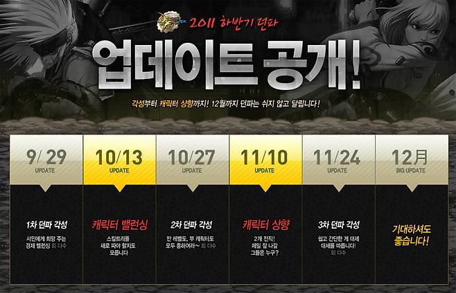 이번 업데이트는 29일부터 2주 간격으로 다섯 단계에 걸쳐 이뤄진다. 29일 '던파 1차 각성'을 시작으로 10월 13일과 27일에는 '전 캐릭터 밸런싱'과 '던파 2차 각성'이, 11월 10일과 24일은 '캐릭터 개편'과 '던파 3차 각성'이 각각 새롭게 선보일 계획이다.