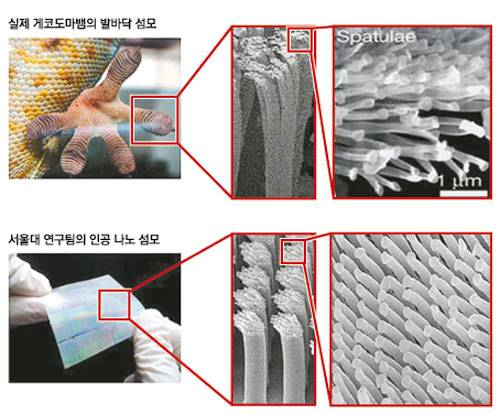 게코도마뱀 발바닥에는 길이 50~100마이크로미터(100만분의 1m)인 털들이 촘촘히 붙어 있다. 이 털들은 각기 바닥이나 천장 등 표면을 끌어당기는 힘을 가지고 있는데, 이 털 수백만 개가 모이면 도마뱀 몸무게도 지탱할 만한 접착력이 생긴다.