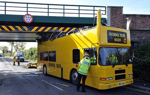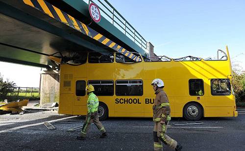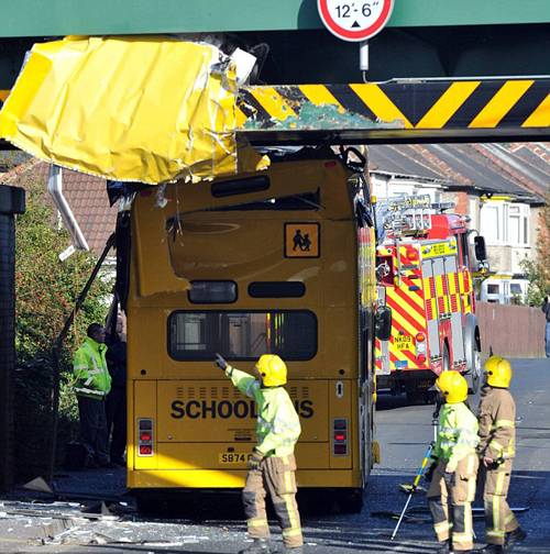 영국에서 학생들을 태운 2층 스쿨버스가 다리를 통과하다 2층이 무너져 내리는 황당한 사건이 발생했다. 23일 영국 일간 데일리메일은 영국 달링턴에서 학생 50명을 태우고 등교중인 2층 스쿨버스가 낮은 다리 아래를 통과하다 지붕과 2층이 완전히 파손돼 버스에 타고 있던 학생들과 운전사 등 14명이 부상을 입고 병원으로 옮겨졌다고 전했다.