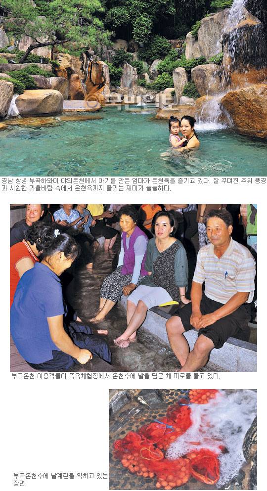 온천의 계절이 돌아왔다. 아침저녁으로 날씨가 선선해지고 산하가 울긋불긋 단풍으로 물들기 시작하면 심신의 피로를 풀어줄 뜨끈뜨끈한 온천이 그리워진다. 행정안전부가 주최하고 국민일보를 비롯해 한국관광공사와 대한온천학회가 후원하는 대한민국 온천대축제가 올해는 경남 창녕 부곡온천에서 열린다. 온천대축제가 열리는 28일부터 5일 동안 부곡온천에서는 관광객을 대상으로 다채로운 이벤트가 진행되고, 유성온천을 비롯한 전국 온천에서는 입장료 할인 행사가 펼쳐진다.