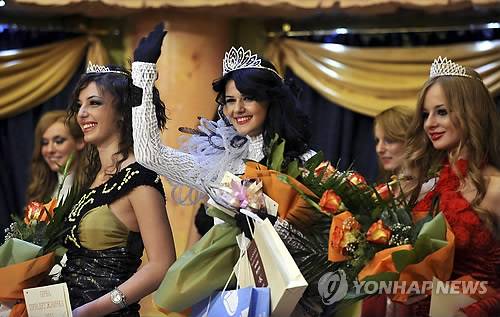 (AP=연합뉴스) 28일(현지시간) 마케도니아 수도 스코페에서 열린 '2011 미스 마케도니아 대회' 1위 수상자인 베스나 자키모프스카(20·가운데)가 청중에게 손 흔들고 있다. 자키모프스카는 오는 11월 런던에서 열리는 미스 월드 대회에서 마케도니아를 대표하게 된다.