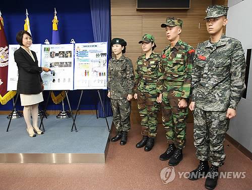 (서울=연합뉴스) 안정원 기자 = 서울대학교 남윤자 교수가 29일 서울 용산구 국방부 브리핑룸에서 오는 10월부터 순차적으로 전 군에 보급되는 디지털무늬의 차세대 신형 전투복과 구형 얼룩무늬 군복의 차이점을 설명하고 있다.