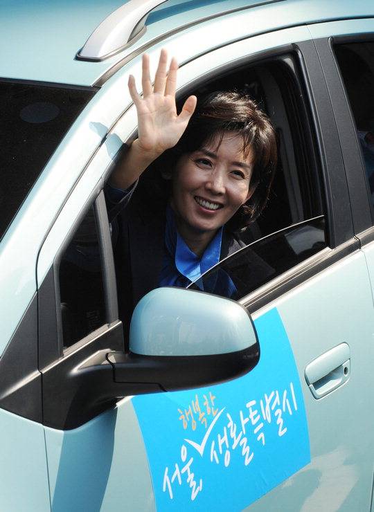 나경원 한나라당 서울시장 후보가 6일 서울 프레스센터에서 열린 선거대책위원회 및 선거사무소 개소식에서 유세에 이용할 마티즈 차량에 탑승해 손을 흔들고 있다.