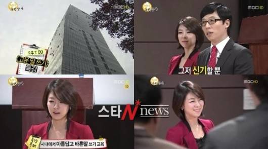 한편 이날 배현진 아나운서는 '무한도전' 방송 화면을 예로 들어 '고운말 쓰기'를 강의, 에이씨는 에잇, 빡빡이는 대머리, 멍청아는 약간은 모자라지만 착한 친구로 정정했다.