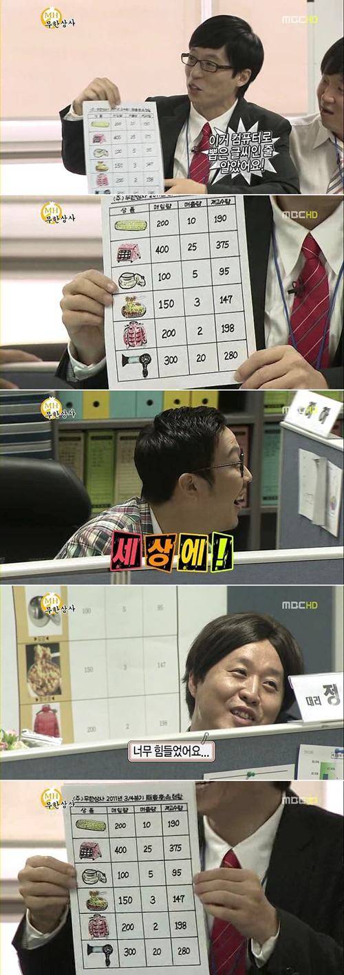 S전자 출신 정형돈은 프로그램을 이용해 뚝딱 표를 만들어 멤버들의 부러움을 샀고 하하는 표 만드는 방법을 몰라 마우스로 그리는 웃지못할 상황이 벌어졌다.