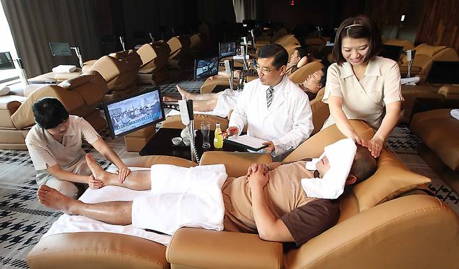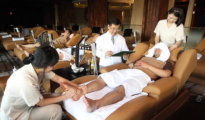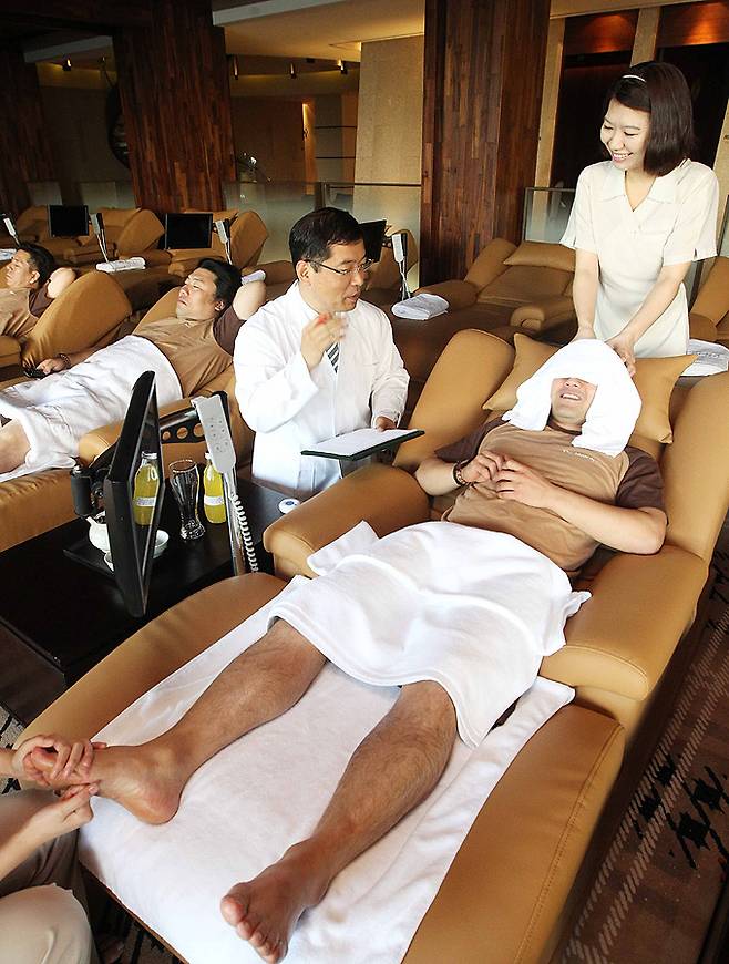 13일 오전 서울 잠원동 더리버사이드 호텔 남성전용 스파에서 고객들이 마사지를 받고 있다. 더리버사이드 호텔 남성전용 '더메디스파'는 1천200평 규모로 한의사 건강체크 및 상담을 무료로 받을 수 있다. <김호영 기자> ▶ [화보] 부산영화제는 오인혜를 위한 영화제?