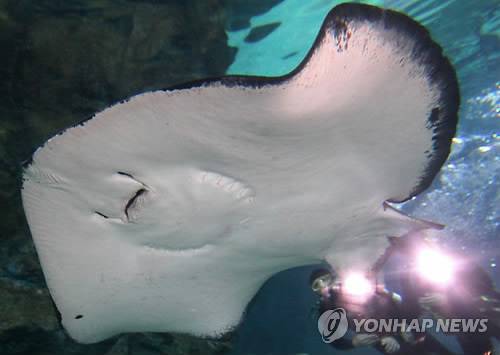 (서울=연합뉴스) 박지호 기자 = 코엑스 아쿠아리움은 몸길이 240cm, 폭 148cm, 무게 100kg 이상인 초대형 흑가오리 1마리를 17일부터 메인수조인 오션킹덤에서 공개했다.