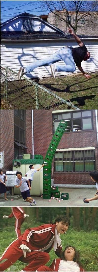 울며 콧물을 흘리는 소녀 아래에 입을 벌리고 콧물을 바라보고 있는 친구와 담치기를 시도했으나 담 끝에 발등이 걸려 아찔한 상황을 보이고 있는 사진 등은 보는 이로 하여금 폭소와 안타까움을 자아내고 있다.