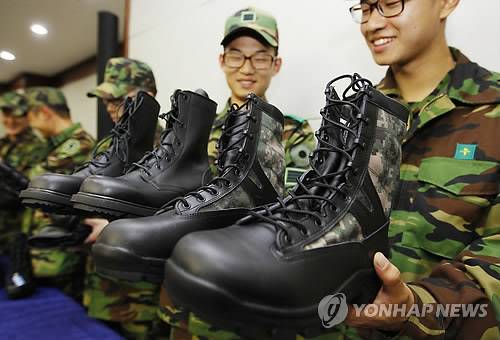 (서울=연합뉴스)이상학 기자 = 20일 서울 용산구 국방부에서 열린 '기능성 전투화' 공개 평가위원회 회의에서 장병들이 다양한 기능이 있는 기능성 전투화(오른쪽)와 현재 착용하고 있는 전투화를 비교해 보고 있다. 기능성 전투화는 기존 전투화보다 130g 정도 가볍고 고어텍스 내피 원단을 사용해 땀 배출 능력 등을 높였다. 통기성이 뛰어난 원단을 사용해 쾌적성을 강화하고 미군 전투화처럼 겨울철 빙판에서 미끄러지지 않도록 제작됐다. 2011.10.20