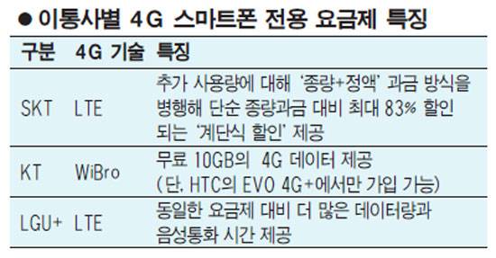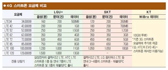 한편 4G 서비스로 와이브로 기술을 내세운 KT는 4G 데이터를 무료로 제공하는 점이 특징이다. KT의 '4G 스마트폰 전용 요금제'는 기존 3G 스마트폰 요금제에 10GB의 와이브로 데이터를 각각 무료로 제공하고 있다. 다만 해당 요금제는 현재 국내 최초의 4G 스마트폰인 HTC의 'EVO 4G+'에만 적용된다. KT 관계자는 "지난 7월 EVO 4G+ 출시 이후 8만명 가량의 고객이 해당 요금제에 가입했다"고 밝혔다.