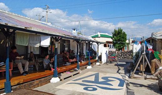 마을의 집들은 대부분 대문이 없다. 곳곳에 아기자기한 구경거리가 널려 있다. 물병·호박 등 다양한 모양으로 귀엽게 꾸민 문패들, 담장에 색색의 타일 벽화, 조형물들…. 비슷하게 꾸며진 지방 소도시의 여느 마을들처럼 공공미술의 흔적이다. 2009년 마을미술 프로젝트 사업을 진행했다고 한다. 많은 여행객들이 사진기를 들이대기 바쁘다.