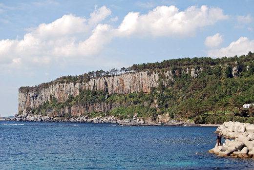 층층 병풍처럼 늘어선 박수기정. 저 위에 오르면 널따란 초원이 펼쳐진다. 밀물 때라 파란 물이 가득 들어차 있다.