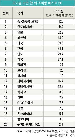 한국은 지난해 총 34억1000만 개를 소비해 6위에 올랐다. 2010년 인구 4820만 명을 기준으로 볼 때 한국인 1명이 한 해 동안 70개의 라면을 먹었다는 계산이 나온다.