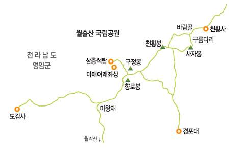 호남고속도로 종점인 광주 요금소로 나와서 제2순환도로로 유덕교차로까지 가서 우회전, 운수교차로에서 다시 우회전해 13번 국도를 탄다. 나주시를 관통하고 영산대교를 건너 이창동 삼거리에서 우회전, 영암군청을 지나서 천황사 사거리에서 우회전하면 월출산 종주코스의 들머리인 천황사 탐방지원센터다. 서해안고속도로로 목포까지 가서 2번 국도와 819번 지방도로를 갈아타고 영암까지 가는 방법도 있다.