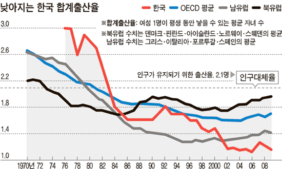 보고서에 따르면 한국의 합계출산율(여자 1명이 가임기간인 15~49세에 낳을 것으로 예상되는 평균 출생아 수)은 1.23명으로 세계 최하위권이다. 한국뿐 아니라 홍콩·대만·싱가포르·일본 등 아시아 선진국들이 합계출산율 1.3명 이하인 초저출산의 늪에서 허우적대고 있다. 유교 전통이 강한 이들 국가는 결혼이 출산의 전제가 된다.
