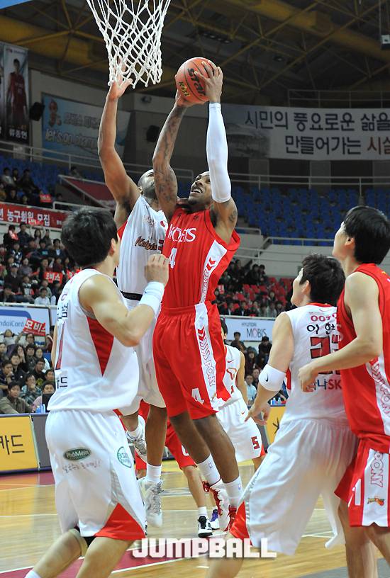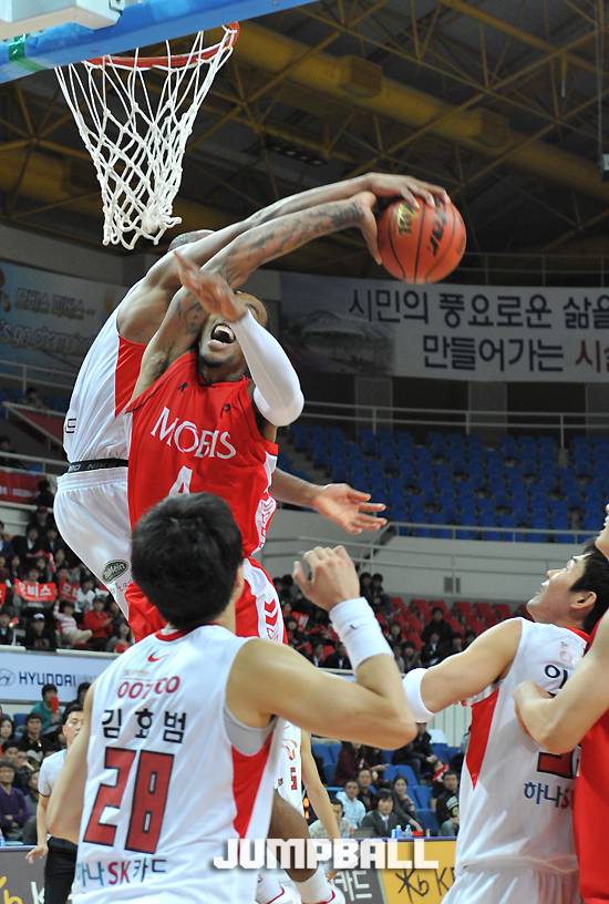 16일 울산 동천체육관에서 열린 2011-2012 KB국민카드 프로농구 SK-모비스의 경기에서 알렉산더 존슨이 말콤 토마스의 슛을 블록하고 있다. 존슨의 이 블록으로 SK는 분위기를 가져올 수 있었다. 저작권자 ⓒ 점프볼. 무단 전재-재배포 금지2011-11-17 울산/윤순철 기자( photoyun68@hanmail.net)