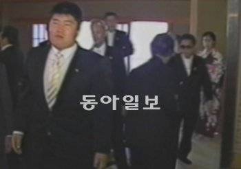 1988년 11월 14일 일본 오사카에서 열린 야쿠자 가네야마구미의 가네야마 고사부로 회장과 국내 칠성파 이강환 회장의 의형제 결연식에 참석한 강호동 씨(점선)가 의식을 지켜보고 있다. 채널A 제공 |