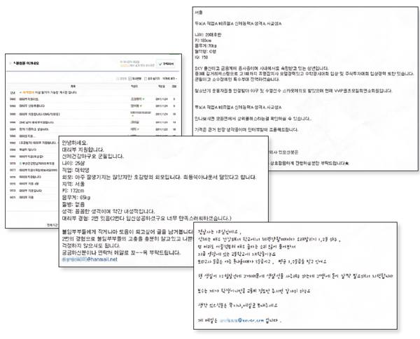 또 다른 대학생은 "명문 K대라고 하시면 어딘지 아시겠죠? 23세, 키 1백75cm, 몸무게 65kg로 적당한 몸입니다. 담배는 안 하고 술은 약간만 합니다. 서울에 거주하고 수원, 인천 등까지 가능합니다"라고 했다. 경기도에 거주하는 한 대학생은 "등록금 때문에 (대리부에) 지원하게 되었다. 자연 수정(성관계)을 통해 두 번의 경력이 있고, 모두 성공했다"라고 강조했다.