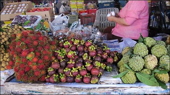 람푸탄, 망고스틴, 두리안 같은 열대과일을 주로 많이 판다.