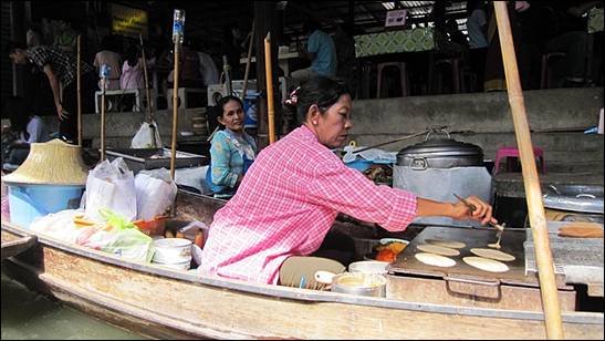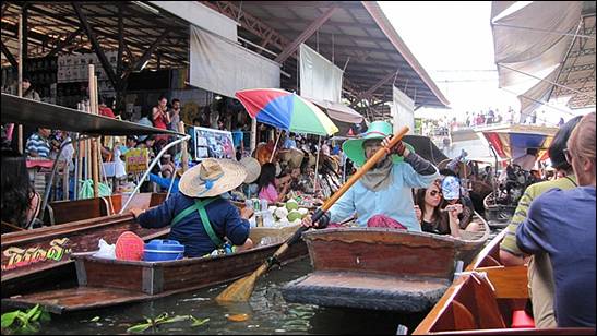 담넉싸두악 수산시장에 도착하여 여행자는 뿔뿔히 흩어져 오전11시까지 자유시간을 가진다. 나는 보트를 타보기로 했다. 수산시장을 운행하는 배는 동력을 이용해 나아가는 모터 배와 사람이 노를 저어 나아가는 배로 나뉜다. 나는 아주머니가 직접 노를 저어가는 배를 타기로 하고 200바트를 지불했다.