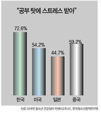 우리나라 청소년들의 학업 스트레스는 '세계 최고' 수준이다. 지난 2월 한국청소년정책연구원이 발표한 < 4개국 청소년 건강실태 국제비교조사 > 보고서가 이를 보여준다. 한국(3993명), 미국(1011명), 일본(1113명), 중국(1176명) 고등학생 1~3학년생 7293명을 대상으로 한 이 조사는 각 나라 청소년이 받는 정신적 스트레스의 양상과 원인을 분석했다.