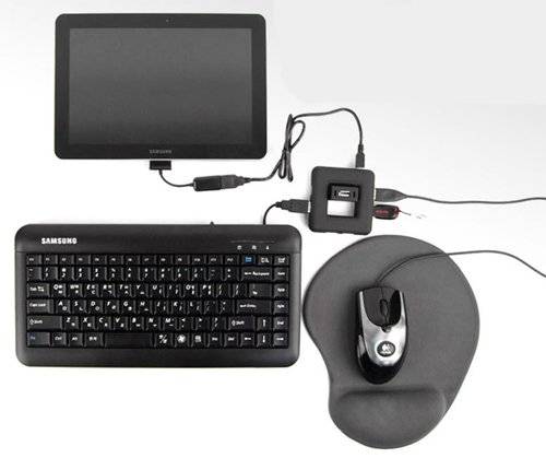 삼성전자 갤럭시탭 10.1은 OTG(On the Go) 기능을 지원해 USB 주변기기를 연결해 쓸 수 있는 제품이다. 충전 및 데이터 전송에 쓰이는 단자는 기다란 삼성 30핀 단자지만 바고니 USB OTG 케이블을 연결하면 키보드, 마우스, USB메모리, 디카 등을 끼우고 인식할 수 있게 된다.