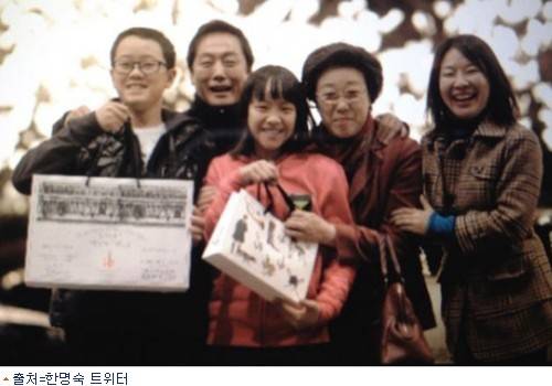 한명숙 전 국무총리는 지난 25일 정 의원 가족과 함께 찍은 사진을 트위터에 게재했다. 사진 속 정 전 의원과 그의 아내, 아들과 딸은 한 전 총리와 함께 환하게 웃고있는 모습이다. 정 전 의원 자녀들은 성탄절 기념 선물로 받은 듯한 쇼핑백을 들고 있다.