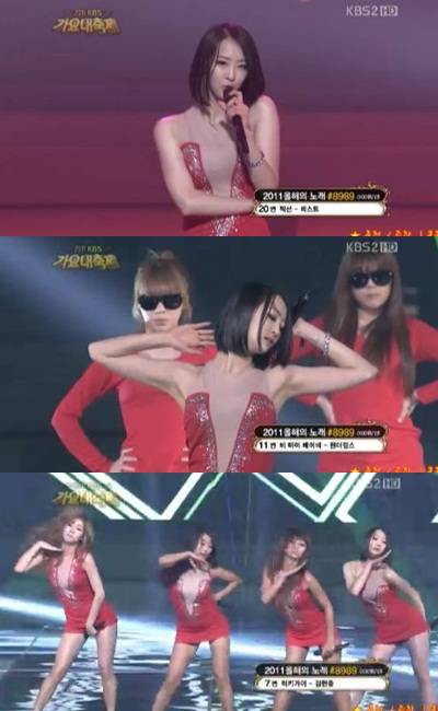 씨스타는 30일 오후 8시 55분 방송된 KBS 2TV '가요대축제'에 출연해 올 해 씨스타를 빛낸 곡 '쏘쿨'을 열창했다. 초반 그룹 클로버가 씨스타 등장 전 이들을 빛내주는 역할을 했지만 그보다 더 눈에 띈 것은 씨스타의 의상이었다.