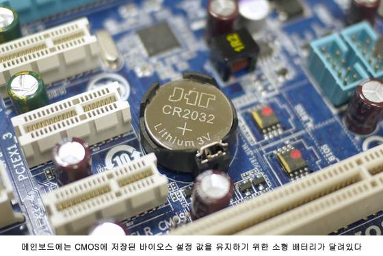 단, 이 CMOS는 전원이 차단되면 기록 내용이 지워지므로 메인보드에는 외부 전원 공급 없이도 CMOS의 바이오스 설정 값 및 내장 시계를 유지하기 위한 소형 배터리가 탑재되어있다. 소형 배터리의 전력이 전부 소모되면 PC를 켤 때마다 바이오스 설정 값과 시계가 초기화 되어버리므로 4~5년 주기마다 배터리를 교환해줘야 한다. 간혹 잘못된 바이오스 설정 값 때문에 PC가 오작동을 일으키는 경우가 있는데, 이때 의도적으로 배터리를 빼서 CMOS에 저장된 바이오스의 설정 값을 강제로 초기화하기도 한다.