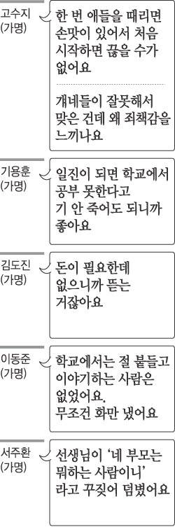 ■ 기용훈(15·중3년)= 그냥 때리고 싶어서 때리는데요. 때리고 싶을 때가 있잖아요. 얼굴만 봐도 때리고 싶은 애가 있으니까 그냥 때리는 거예요. 그냥 재수없어서 때린 거니까 안 미안해요.