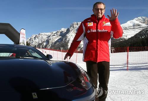 epa03056334 Ferrari's President of the F1 Team Stefano Domenicali poses with a Ferrari FF during the 'Vroom 2012' F1 and MotoGP Press Ski Meeting - Ducati and Ferrari annual media event - in Madonna di Campiglio, Italy, 11 January 2012. MotoGP riders of Ducati and Formula One drivers of Scuderia Ferrari are jointly meeting the media in the Italian mountain resort of Madonna di Campiglio. EPA/MATTEO BAZZI < 연합뉴스 모바일앱 다운받기 >< 포토 매거진 >< 저작권자(c)연합뉴스. 무단전재-재배포금지. >