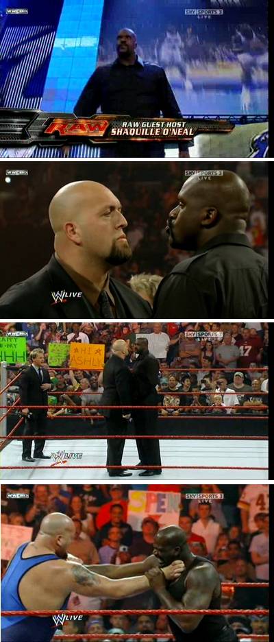 오닐은 지난 2009년 7월 워싱턴 MCI 센터에서 열린 러(Raw) 쇼에도 깜짝 등장해 빅 쇼와 대립했다. 오닐은 출연 당시 빅 쇼를 '팻 보이(Fat Boy)'라 부르고, 크리스 제리코를 '크리스티나'라고 조롱하는 등 WWE에 최적화 된 입담으로 큰 호응을 얻었다. 또 메인이벤트에서는 빅 쇼와의 힘 겨루기를 펼쳐 경기장을 뜨겁게 달구었다.