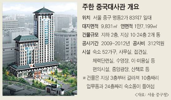 명동 중국대사관 자리는 1882년 임오군란 이후 청나라 주둔지로 사용되다 대한민국 정부 출범 이후 수교를 맺은 대만이 대사관을 지어 사용했다. 1992년 한국이 중국과 수교하면서 건물 소유가 중국으로 넘어갔으며, 2001년 말 대사관 신축계획이 발표되면서 중국대사관은 효자동으로 임시 이전했다. 하지만 예산 확보의 어려움으로 공사계획을 연기하는 등 우여곡절을 겪다가, 2008년 서울시 건축허가를 받고 이듬해 착공에 들어가 올해 말 준공을 앞두고 있다.
