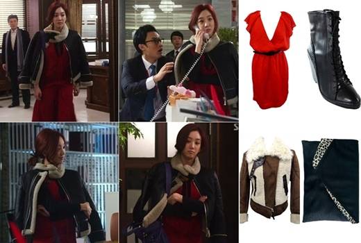 자칫 둔해 보일 수 있는 무통 재킷에 섹시함이 물씬 나는 페미닌한 드레스를 착용하여 세련된 분위기를 냈다. 여기에 밀리터리 부츠와 클러치를 착용한다면 무통 재킷패션을 더욱 시크하게 입을 수 있다. (사진출처: SBS 드라마 '샐러리맨 초한지' 방송 캡처, 보브, 아르마니 익스체인지, 컬쳐콜, 이두라)