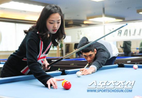 핸디캡 없는 '진검승부'라면 '국가대표' 차유람에게 일방적인 원사이드 경기다. 나인볼을 한번에 몰아넣을 수도 있다. 당연히 '초심자' 김요한을 배려했다. 차유람이 찬스볼을 내준 후 표적구인 7번공 앞에 훈련용 '이미지볼'을 갖다놓고 원포인트 레슨을 실시했다. "방금 이미지볼 위치 기억했죠? 아래를 강하게 치세요"하더니 이미지볼만 빼낸다. 힘찬 타구에 7번공이 맹렬히 움직이더니 마법처럼 쏙 빨려든다. "오! 내가 넣고 내가 놀랐어!" 김요한의 탄성이 터졌다.